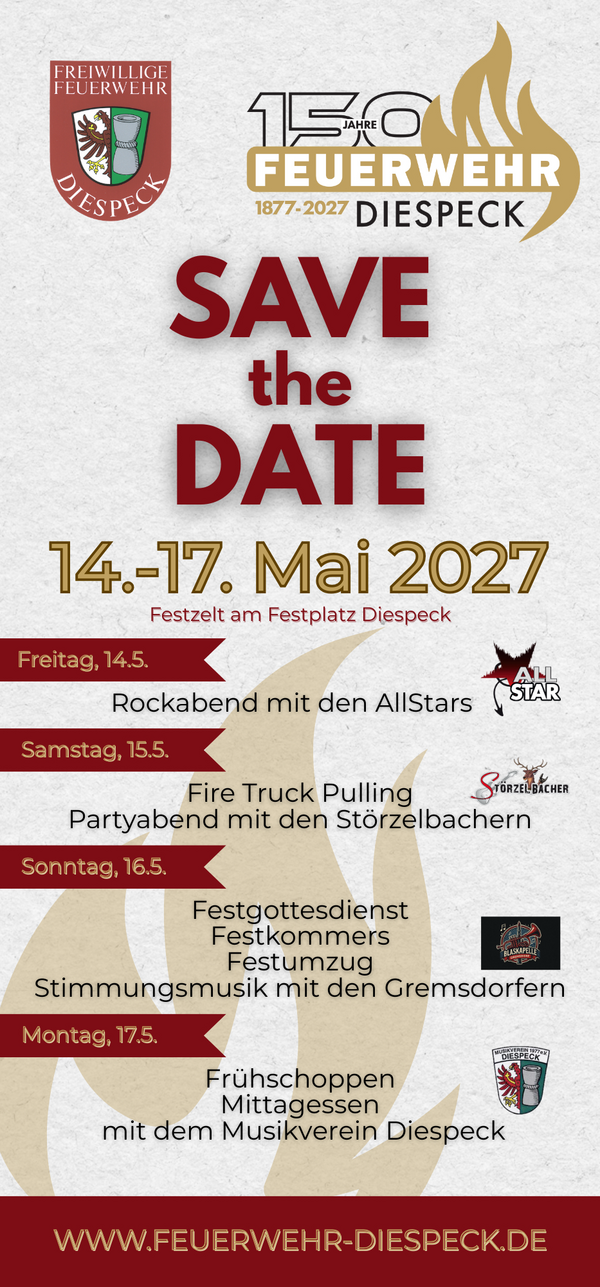 Home Termine 150 Jahre FF Diespeck 14.05.2027 00:00 Abschnitt A Feuerwehrjubiläen 14.-17.05.2027 (Programm zum Download) 150 Jahre FF Diespeck.png Zu Kalender hinzufügen